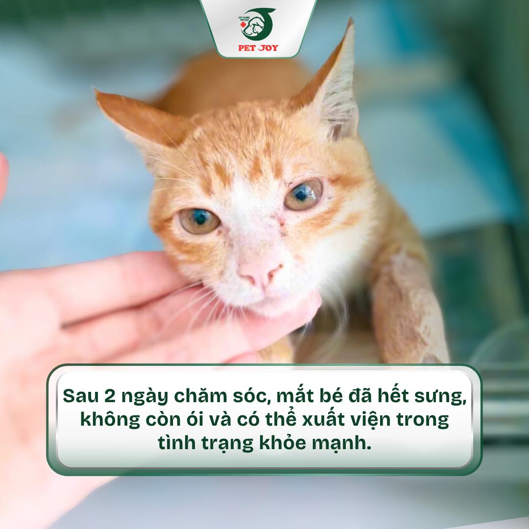 🩺 Ngay khi tiếp nhận, đội ngũ bác sĩ Pet Joy đã tiến hành vệ sinh mắt khẩn cấp, truyền dịch, cấp thuốc giải độc gan, chống viêm và hỗ trợ đường tiêu hoá để hạn chế tối đa độc tố lan rộng trong cơ thể. Suốt 2 ngày điều trị tích cực, bé đã có những chuyển biến tích cực — hết sưng, không còn ói, ăn uống trở lại và có thể xuất viện về nhà.